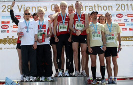 17.04.2011 Vienna City Marathon 2011 über 32.000 Teilnehmer Platz 3 mit meinem Team bei der Staffel - der Sieg ging an Dänemark Ideale Laufbedingungen, fast Teilnehmerrekord und eine tolle Stimmung zeichneten den 28. Vienna City Marathon aus. Ich startete in der Staffel mit Andreas Vojta, Thomas Thalhammer und Christoph Mrkvicka und hatte den dritten Abschnitt von der Wiener Universität zum Prater - 9,1 km - zurückzulegen. Unser Startläufer Andi Vojta konnte die ersten 2 km mit dem zweifachen äthiopischen Olympiasieger Haile Gebrselassie mithalten, der in Wien den Halbmarathon gelaufen ist und überlegen gewonnen hat. Unsere Mannschaft lief sehr stark, die von Trainer Willy Lilge trainiert wird. An diesem Tag war die dänische Staffel aber nicht zu schlagen. Platz zwei ging an das Vorarlberger Forever Power Team. Die 42,195 km der Männer stand im Zeichen der Kenianer - da gab es einen 8-fach-Sieg. Bester Österreicher war Roman Weger mit 2:18:24. Bei den Frauen siegte Tola Fate aus Äthiopien. Mein nächster Bewerb: |